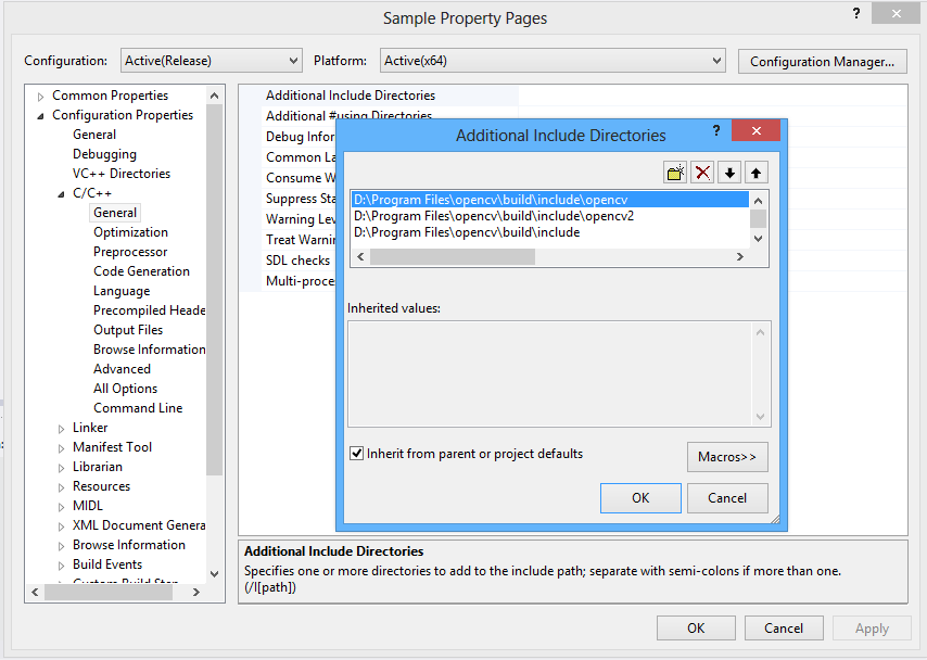 Then browse to $opencv\build\include and cilck select. Similarly add $opencv\build\include\opencv2 and $opencv\build\include\opencv directories too. So finally it would look like below.Then click OK.